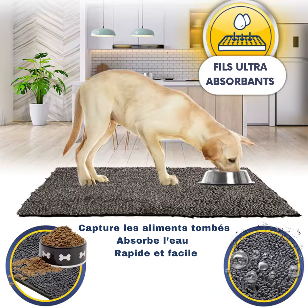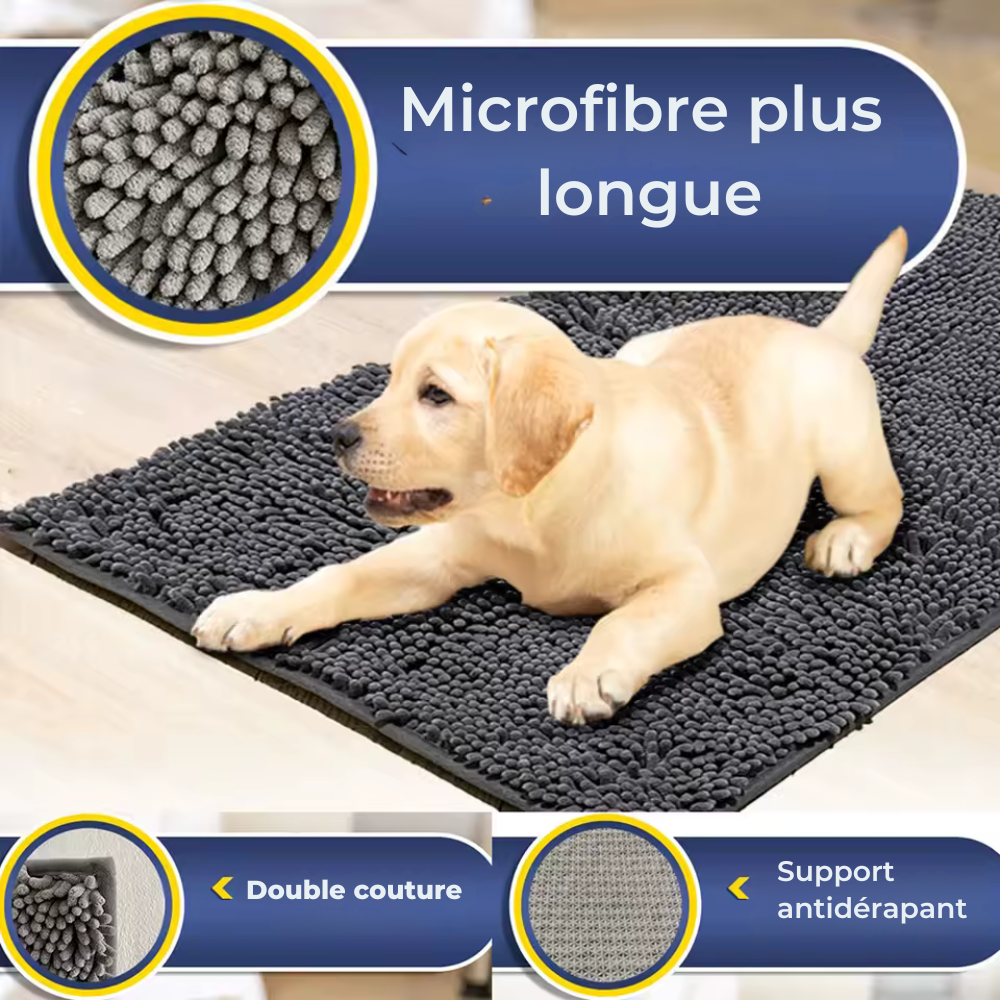 CleanPaw – Tapis Ultra-Absorbant pour Entréecapture la boue, l’eau et la saleté dès que votre chien rentre à la maison. Grâce à sa surface ultra-absorbante, les pattes sont essuyées en quelques pas, avant même que les traces n’atteignent votre sol. Résultat : une maison plus propre, moins de ménage, et plus de tranquillité au quotidien.