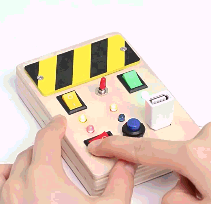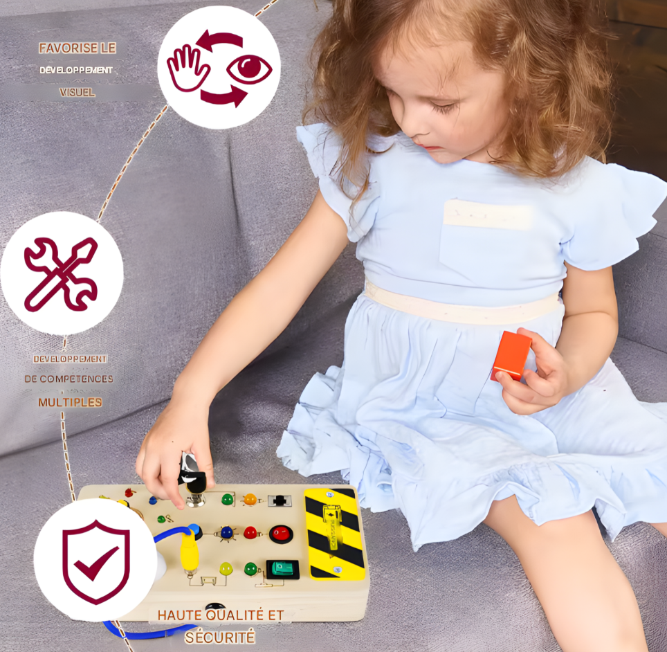 Ce busy board en bois invite votre enfant à explorer, toucher et manipuler différents éléments lumineux et mécaniques. Chaque geste développe sa curiosité naturelle tout en rendant l’expérience amusante et intuitive.