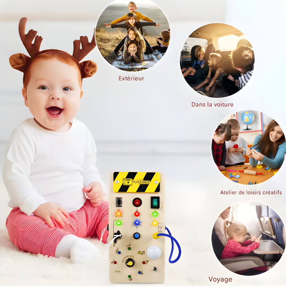 Offrez à votre enfant un monde d’exploration avec ce busy board en bois rempli d’interrupteurs, lumières LED et petits mécanismes. Un jeu sensoriel qui stimule la curiosité, encourage l’autonomie et transforme chaque moment en apprentissage amusant. 🎨🔦🧩